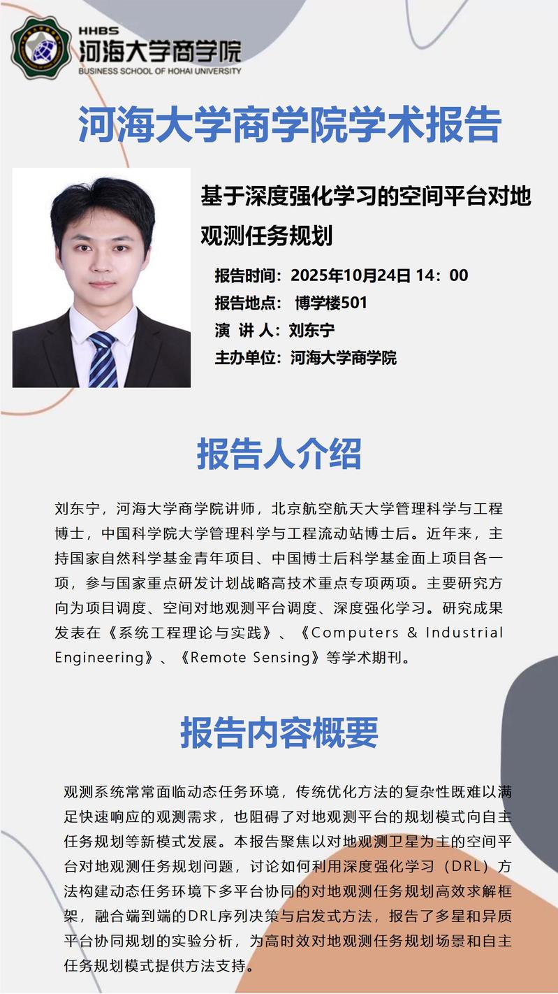 讲座通知:基于深度强化学习的空间平台对地观测任务规划